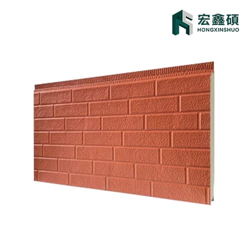 Hongxinshuo Decorative Insulation Board is a composite façade panel using color-coated galvanized steel or aluminum sheets as facings with PU, EPS or rock wool insulation cores. Produced on a continuous laminating line, the panel features an embossed brick pattern and groove design, integrating thermal insulation and decorative cladding in one product. It is widely used for exterior walls of industrial and civil buildings, perimeter walls and renovation projects, offering a high-efficiency alternative to traditional masonry, coatings and wet-applied insulation systems.